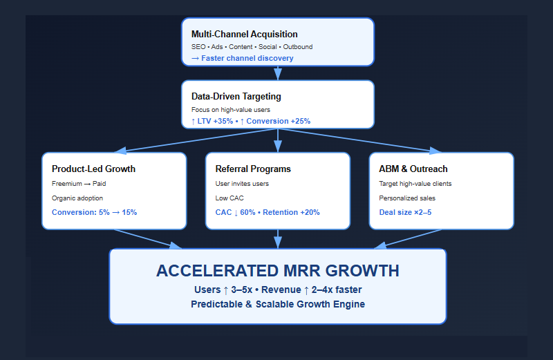 When different customer acquisition methods work together, a SaaS company achieves a sustainable growth system. This approach not only helps increase the number of users but also accelerates MRR growth.