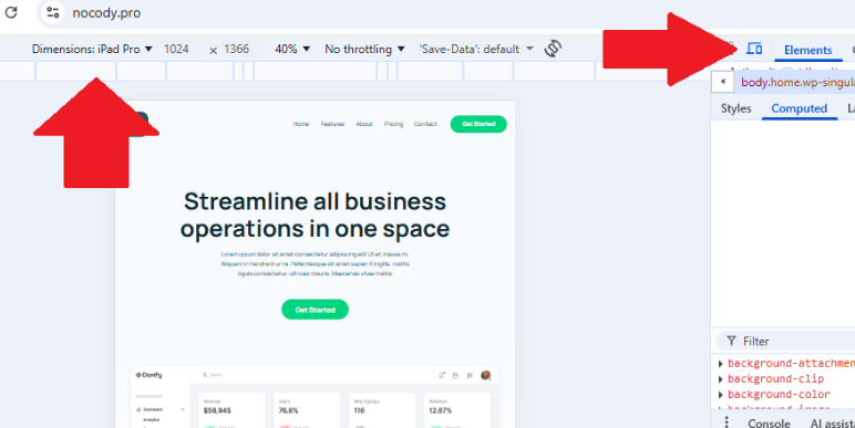 If you want to test how your site will look on different devices, open your computer’s browser (I use Mozilla), then press F12 on your keyboard. You’ll see a screen for testing different devices. Select “Mobile devices and tablets” on the right, and there’s a drop-down box on the left where you can select different devices. The example below shows how my site looked on iPad Pro after installing WordPress.